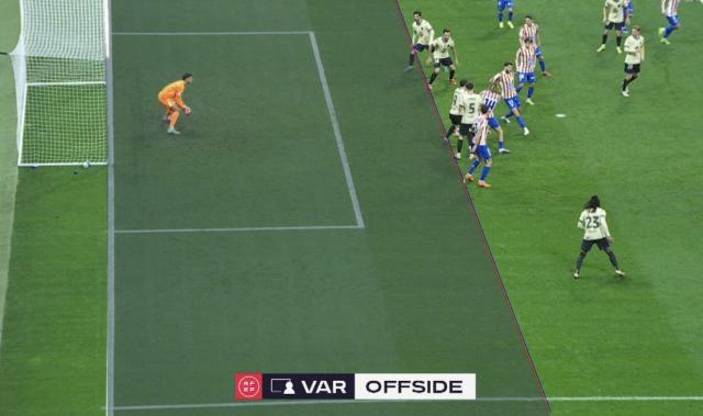 第52分钟,巴萨战术任意球,库巴西门前得分,但VAR复核认定此前莱万脚跟越位,进球无效。